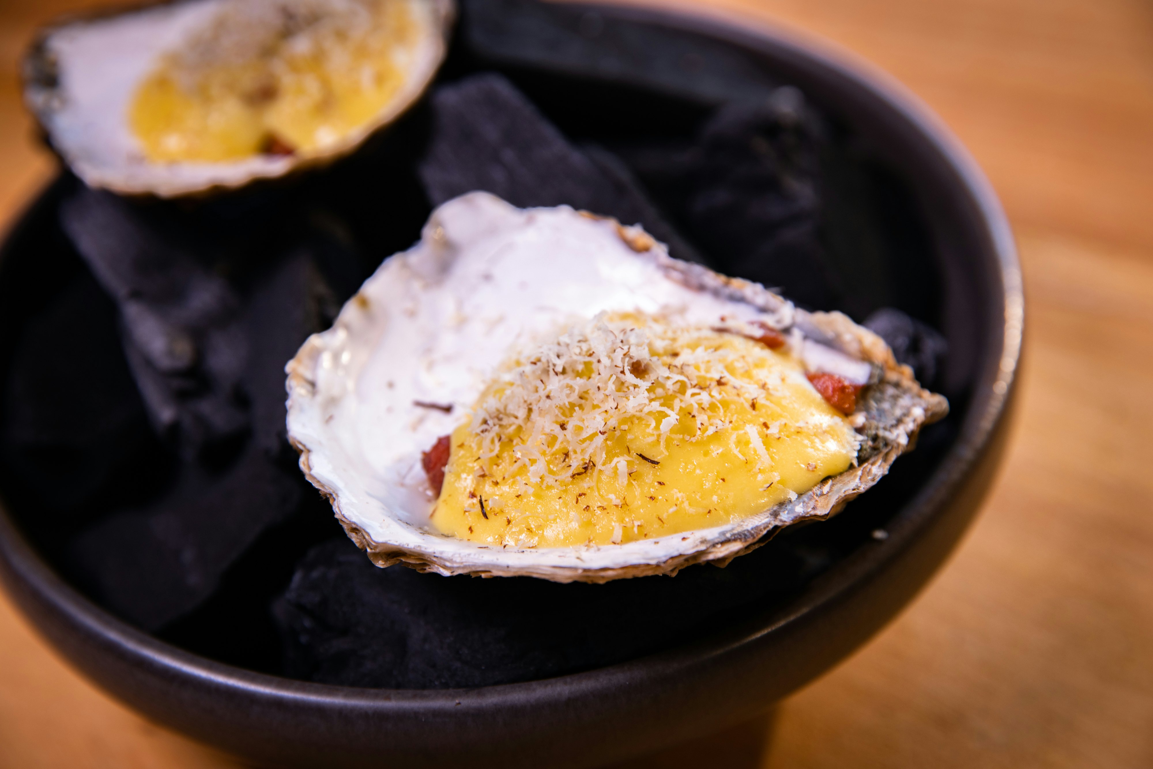 Top hver lune østers med bacon, kom lidt sauce over og riv ristede hasselnødder over.