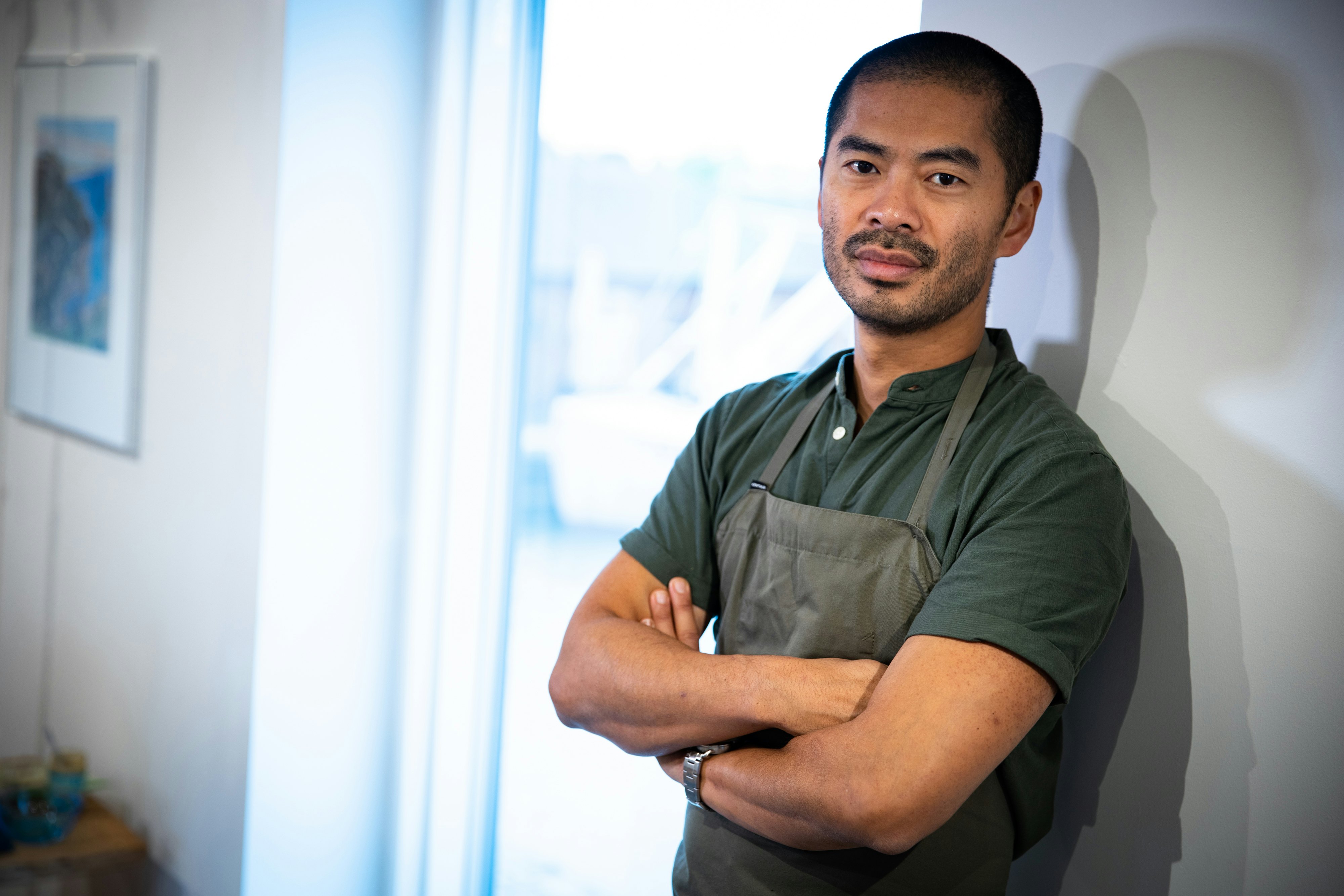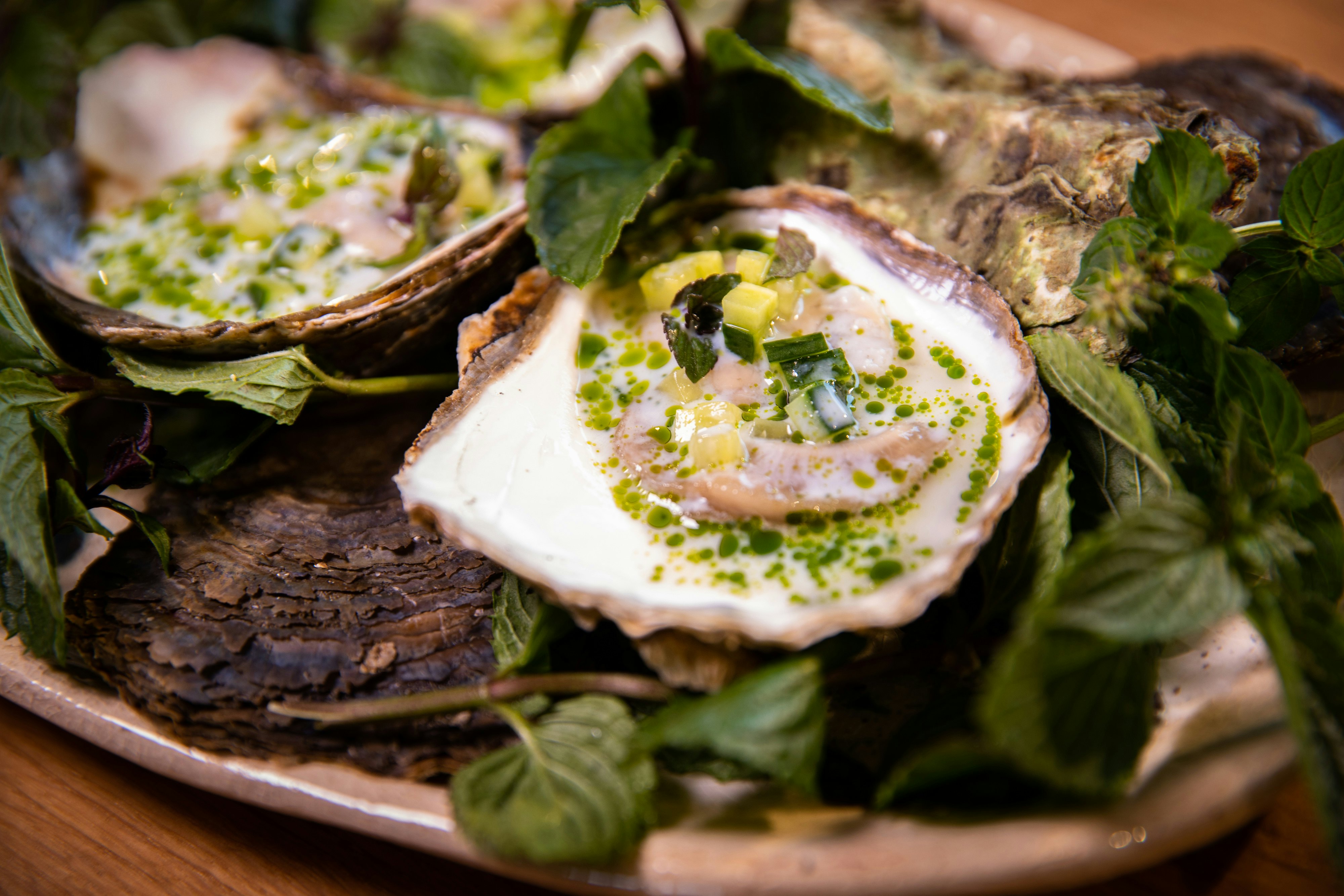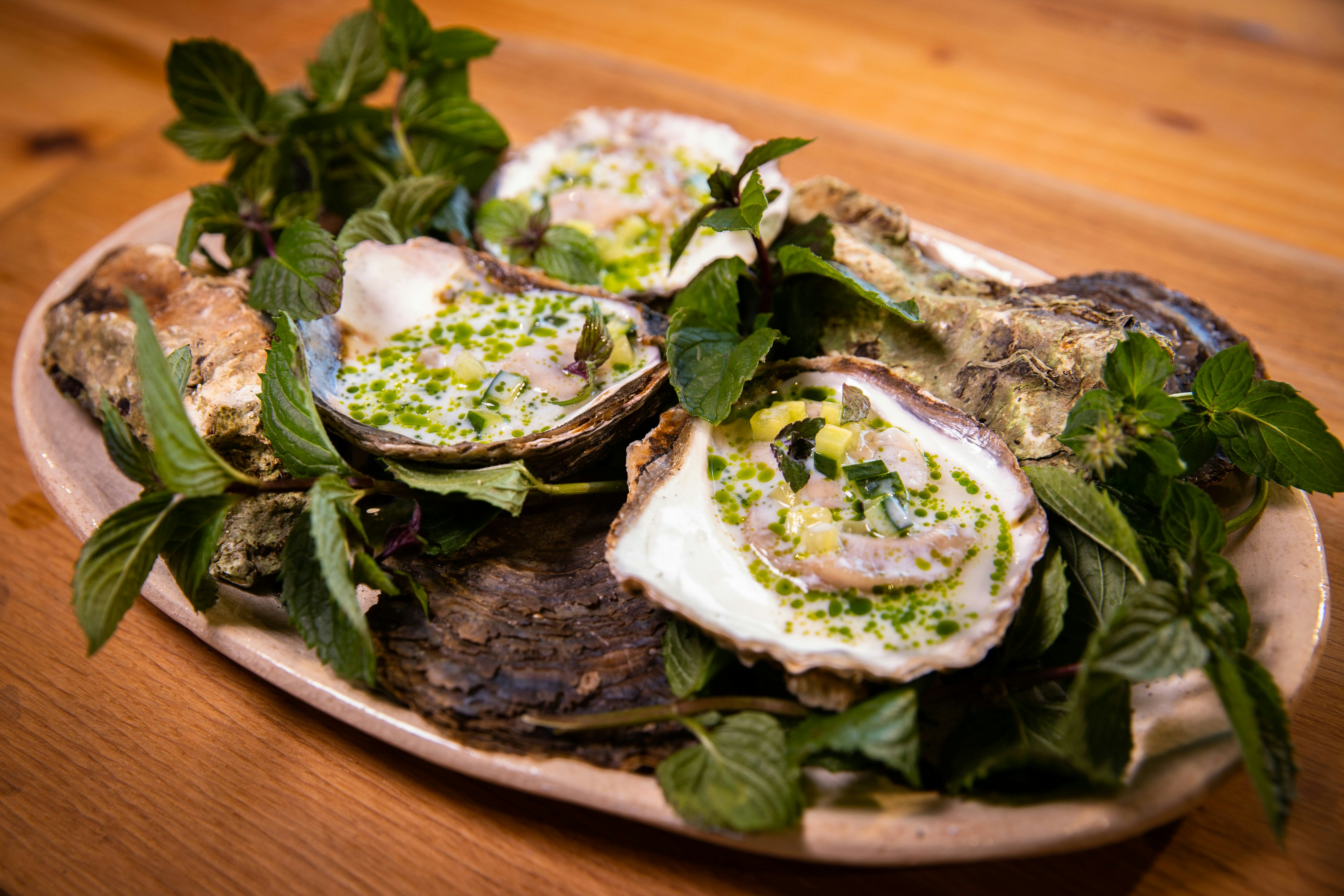 Ved serveringen anrettes østersene i egne skaller. Bland et par skefulde mynteolie i kærnemælken og fordel lidt over østersene.